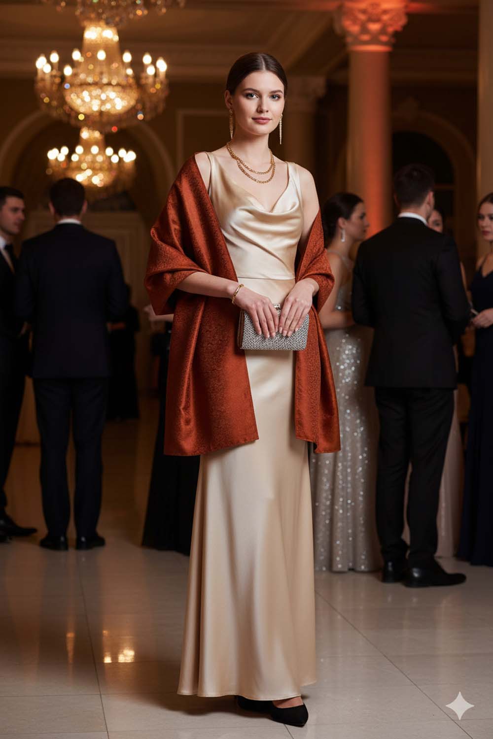 The shawl can be described as a luxurious and versatile piece, adding a refined touch of beauty and elegant sophistication whether worn at special occasions or evening events with a glamorous dress, or styled with a simple blouse, blazer, jacket, or long coat to bring a sense of opulence and refined taste, reflecting an appreciation for high-quality, artisanal fabrics.